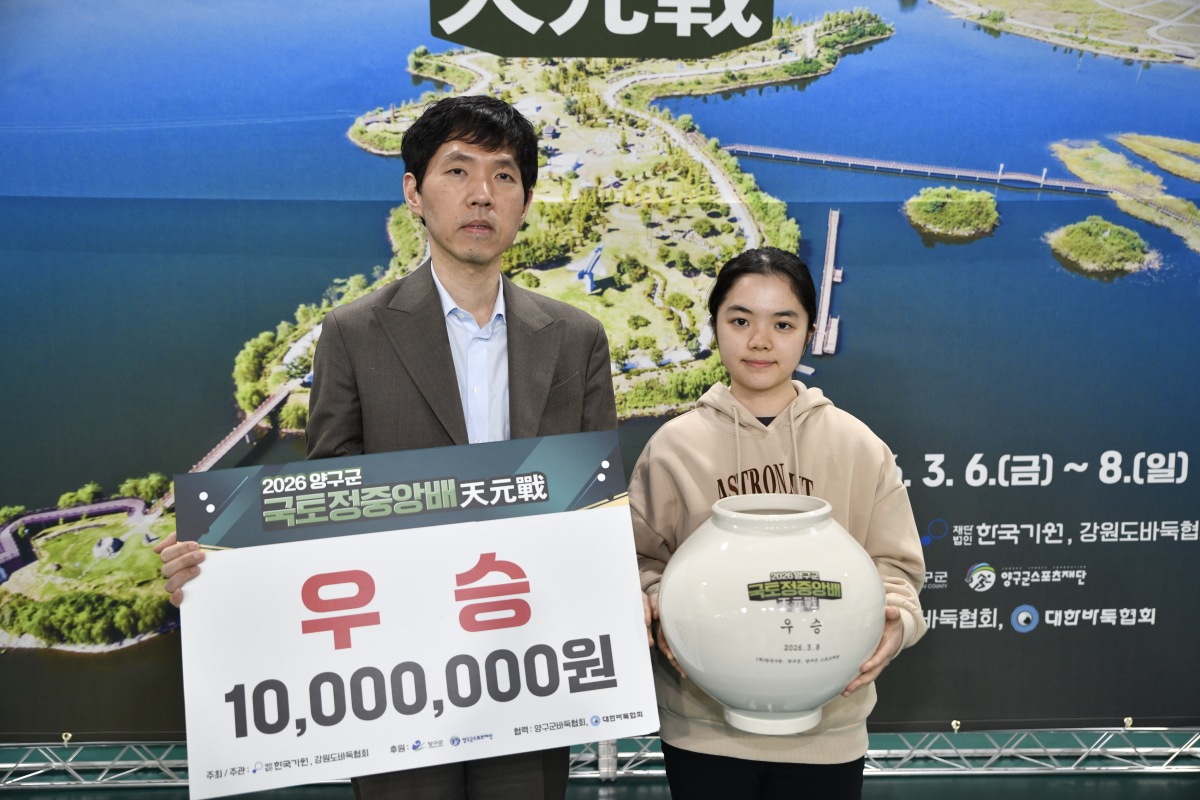 [서울=뉴스핌] 김용석 기자 = 스미레 4단이 8일 강원도 양구군 양구종합 스포츠타운에서 열린 2026 양구군 국토정중앙배 천원전 결승에서 정준우 3단을 184수 만에 백 불계승으로 꺾는 등 전승 우승을 차지했다.