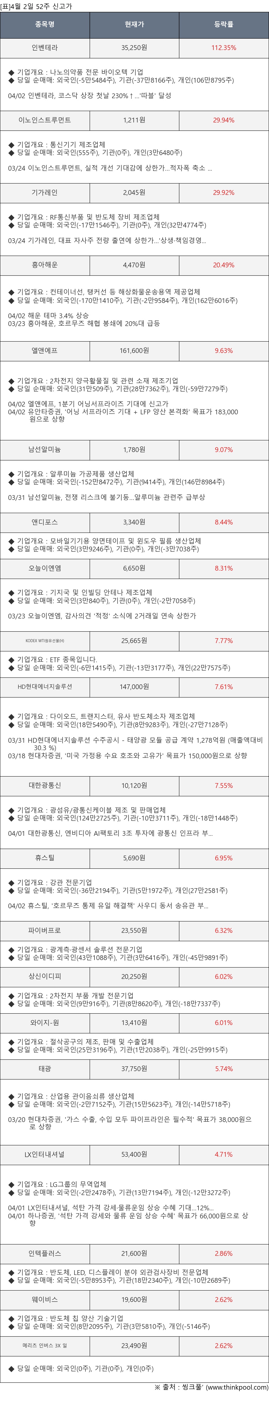 [서울=뉴스핌] 로보뉴스 = 4월 2일, 인공지능 투자비서 ‘AI라씨로’는 52주 신고가가 발생한 인벤테라(0007J0), 이노인스트루먼트(215790) 등의 최근 동향을 분석해서 발표했다.