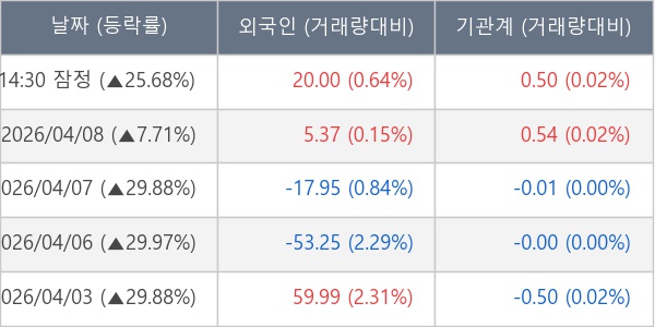 [서울=뉴스핌] 로보뉴스 = 09일 14시 35분 현재 광전자(017900)는 외국인과 기관이 각각 20.00 만 주, 0.50 만 주 순매수(잠정) 하면서 전일 대비 25.68% (현재가 10,180원) 상승하고 있다.