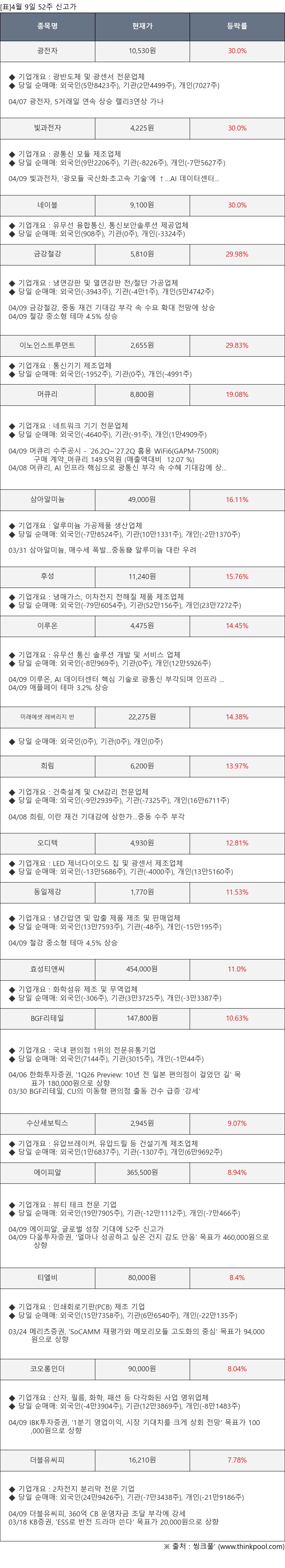 [서울=뉴스핌] 로보뉴스 = 4월 9일, 인공지능 투자비서 ‘AI라씨로’는 52주 신고가가 발생한 광전자(017900), 빛과전자(069540) 등의 최근 동향을 분석해서 발표했다.