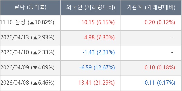 [서울=뉴스핌] 로보뉴스 = 14일 11시 30분 현재 퀄리타스반도체(432720)는 외국인과 기관이 각각 10.15 만 주, 0.20 만 주 순매수(잠정) 하면서 전일 대비 10.82% (현재가 17,520원) 상승하고 있다.