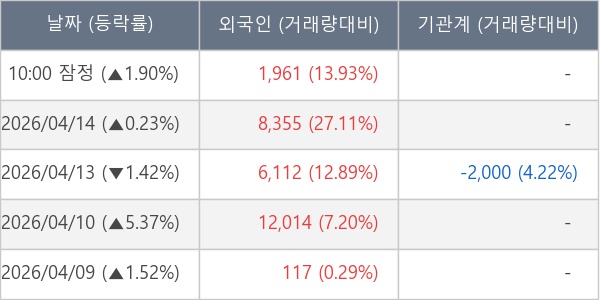 [서울=뉴스핌] 로보뉴스 = 15일 10시 15분 현재 다산디엠씨(208860)는 전일 대비 1.90% (현재가 1,343원) 상승했고, 외국인이 최근 6일 연속 순매수(누적 38,518주, 잠정) 행진을 하고 있다.