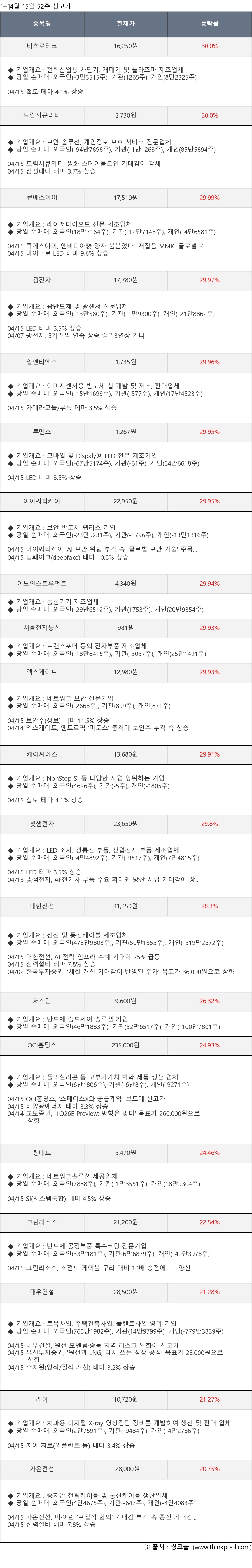 [표]4월 15일 52주 신고가 종목 및 최근 동향