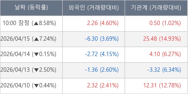 [서울=뉴스핌] 로보뉴스 = 16일 10시 15분 현재 심텍(222800)은 외국인과 기관이 각각 2.26 만 주, 0.50 만 주 순매수(잠정) 하면서 전일 대비 8.58% (현재가 77,200원) 상승하고 있다.