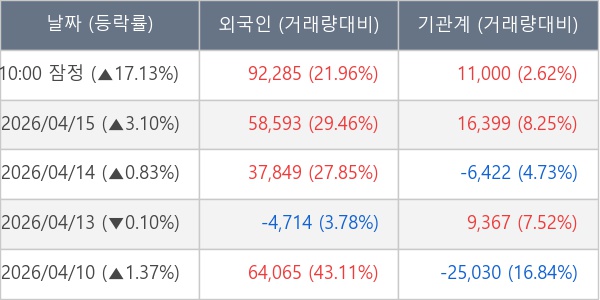 [서울=뉴스핌] 로보뉴스 = 16일 10시 15분 현재 SKC(011790)는 외국인과 기관이 각각 9.23 만 주, 1.10 만 주 순매수(잠정) 하면서 전일 대비 17.13% (현재가 116,900원) 상승하고 있다.