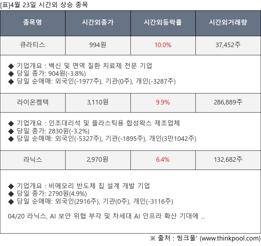 [서울=뉴스핌] 로보뉴스 = 4월 23일, 인공지능 투자비서 ‘AI라씨로’는 시간외 단일가 매매에서 주가가 크게 변동한 큐라티스(348080), 라이온켐텍(171120) 등의 최근 동향을 분석해서 발표했다.