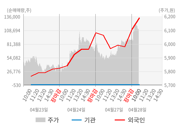 [서울=뉴스핌] 로보뉴스 = 28일 10시 15분 현재 케이피에프(024880)는 전일 대비 1.33% (현재가 6,110원) 상승했고, 외국인이 최근 9일 연속 순매수(누적 31.69만 주, 잠정) 행진을 하고 있다.