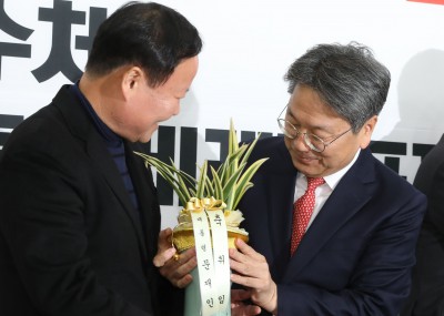 [사진] 김재원 정책위의장에게 축하 난 전달하는 강기정 정무수석
