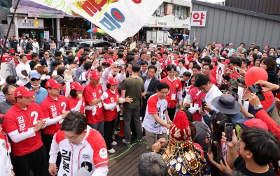 권성동 원내대표와 강릉 시민들에게 인사하는 김문수 후보