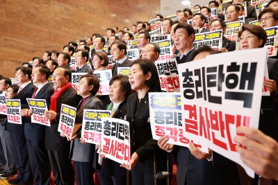 구호 외치는 권성동 국민의힘 대표 권한대행, '총리탄핵 결사반대'