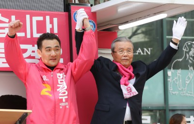 함경우 고양을 후보 손 들어올리는 김종인 총괄선대위원장