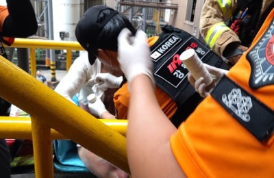 [사진]폭발 사고로 화상 입은 동부메탈 직원 두모씨 헬기 이송