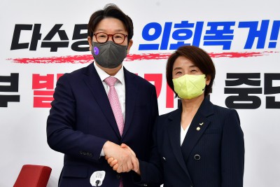 [영상] 손잡은 김태년·배진교 "우리는 촛불 개혁 파트너"