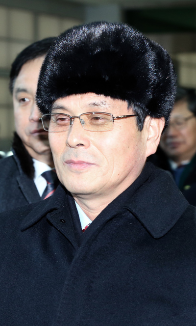 [뉴스핌 포토] 털모자 쓴 윤용복 北 단장, '반갑습네다'