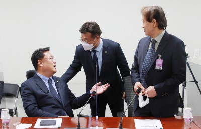 악수하는 윤호중 더불어민주당 의원 - 이명훈 고려대 교수