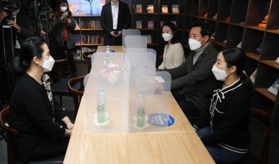 공유어린이집 관계자와 대화 나누는 오세훈 국민의힘 서울시장 후보