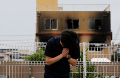 [사진] 日 교토 방화사건 희생자를 애도하는 한 남자