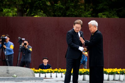 명계남 노무현재단 상임운영위원과 대화 나누는 이재명 대선 후보