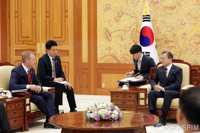 [사진] 패트릭 섀너핸 미국 국방부 장관 대행과 환담하는 문대통령