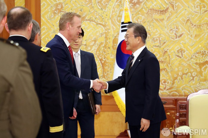 [사진] 패트릭 섀너핸 미국 국방부 장관 대행과 악수하는 문대통령
