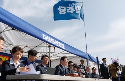 박수치는 광화문 더불어민주당 '천막당사 현판식'의 이재명 당대표