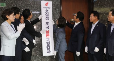 [사진] 현판 거는 나경원 '文실정-조국 심판 국정감사'