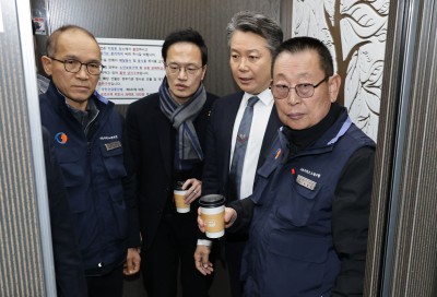 엘리베이터에서 서울시내버스 노조대표와 대화하는 박주민 더불어민주당 국회의원