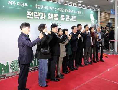 "대전 파이팅" 북콘서트서 시민들과 기념촬영하는 이장우 시장