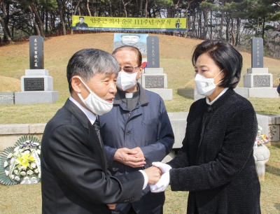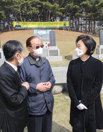 '안중근 의사 111주년 추모식' 참석자들과 대화 나누는 박영선 후보